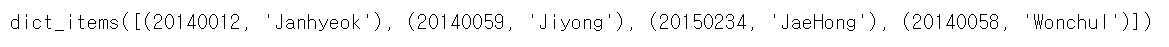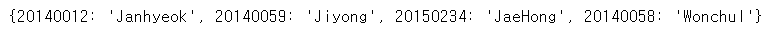 student_info = {20140012:'Janhyeok', 20140059 : 'Jiyong', 20150234: 'JaeHong', 20140058 : 'Wonchul'}