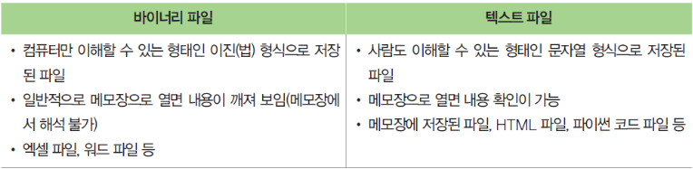 - 컴퓨터에서 파리의 종류는 다양하지만, 기본적으로 바이너리 파일(binary file)과 텍스트 파일(text file), 두 가지로 분류할 수 있다.