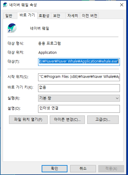 - 아이콘을 클릭하여 프로그램을 실행하는 것이 아니라, 실제로는 아이콘과 연결된 파일이 실행되는 구조다. 아이콘에서 마우스 오른쪽 버튼을 클릭하고, 속성을 선택하면 다음과 같은 화면을 볼 수 있다.