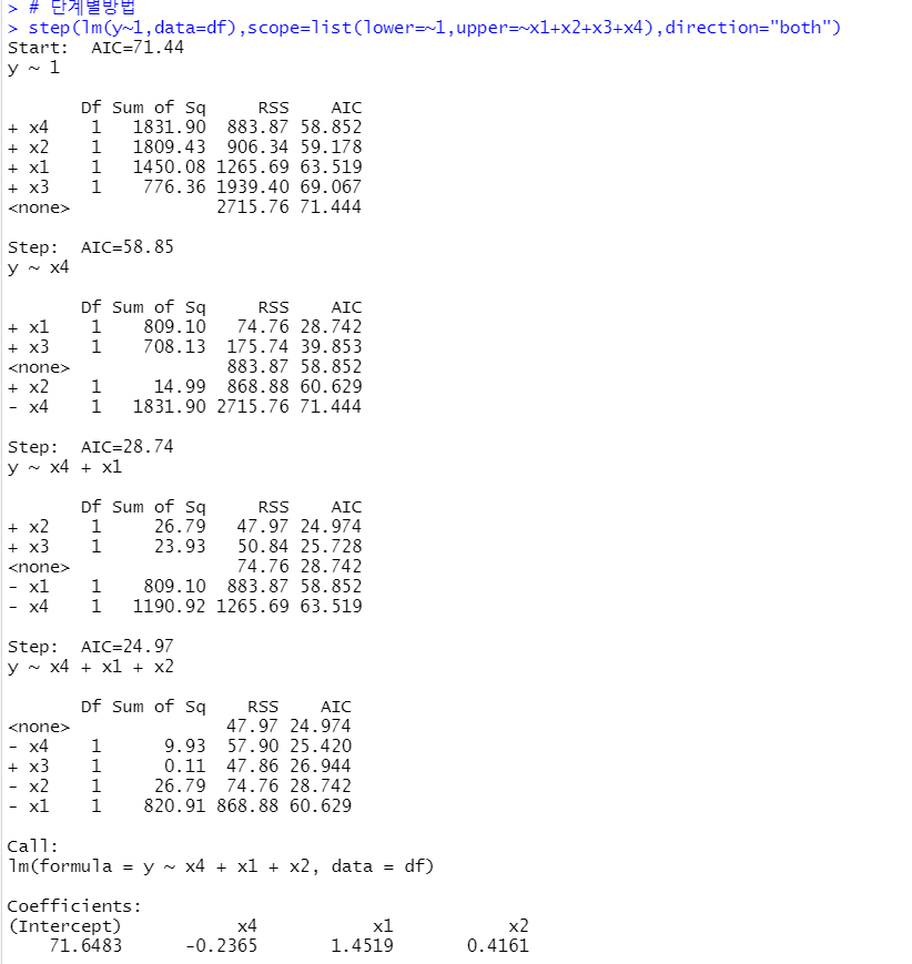 - 단계별 방법(stepwise method) = 전진선택법 + 후진 선택법 전진선택법에 의해 변수를 추가하면서 새롭게 추가된 변수에 기인해 기존 변수의 중요도가 약화되면 해당 변수를 제거하는 등 단계별로 추가 또는 제거되는 변수의 여부를 검토해 더 이상 없을 때 중단