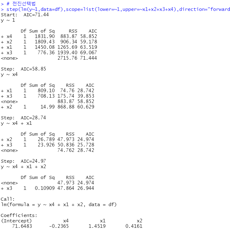 - 전진 선택법(forward selection) : 절편만 있는 상수 모형으로부터 시작해 중요하다고 생각되는 설명변수부터 차례로 모형에 추가