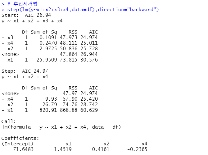 - 후진 제거법(backward elimination) : 독립변수 후보 모두를 포함한 모형에서 출발해 제곱합의 기준으로 가장 적은 영향을 주는 변수부터 하나씩 제거하면서 더이상 유의하지 않은 변수가 없을 때까지 설명변수를 제거하고 이 때의 모형을 선택