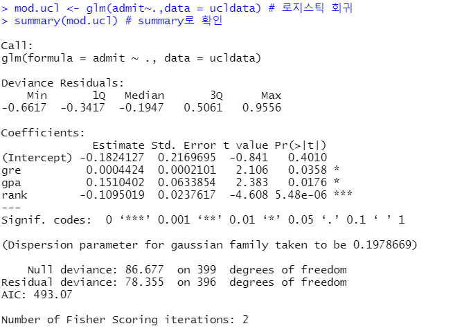 mod.ucl <- glm(admit~.,data = ucldata) # 로지스틱 회귀
