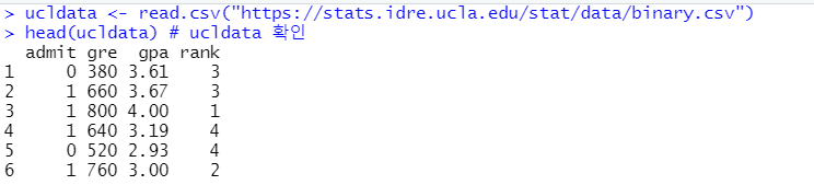 ucldata <- read.csv("https://stats.idre.ucla.edu/stat/data/binary.csv")